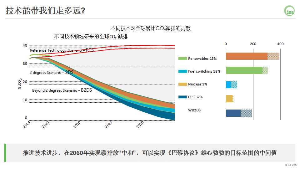 從參考情景(RTS)變?yōu)樵诒臼兰o末將全球平均溫升控制在2攝氏度的2DS情景,意味著要減少累計CO2排放約760 Gt(7600億噸)。