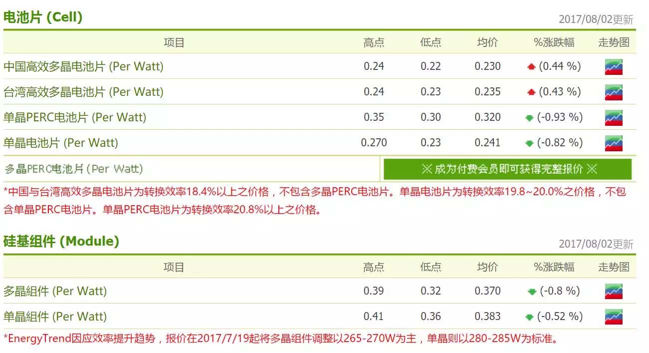 本周單晶組件進入價格保衛(wèi)戰(zhàn),單晶280W的成交價在RMB 3-3.02/W,近期有可能受到多晶缺貨影響稍稍止跌。陸廠的多晶組件價格則受到國內(nèi)需求轉(zhuǎn)弱的影響,也開始有微幅的松動,成交主流在RMB 2.83-2.87/W之間。而第三地組件則因為雙反壁壘以及201案致使有極佳的議價優(yōu)勢,價格仍維持在高段的US$ 0.38/W。