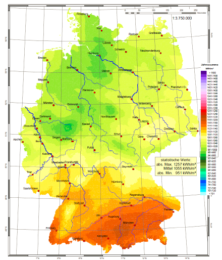 德國的日照條件并不好。年平均日照強度,最高的地區(qū)為1257千瓦時/平方米,最低的地區(qū)為951千瓦時/平方米,平均為1055千瓦時/平方米,比中國三類地區(qū)的平均日照強度還要低。下圖是德國的日照強度地圖: