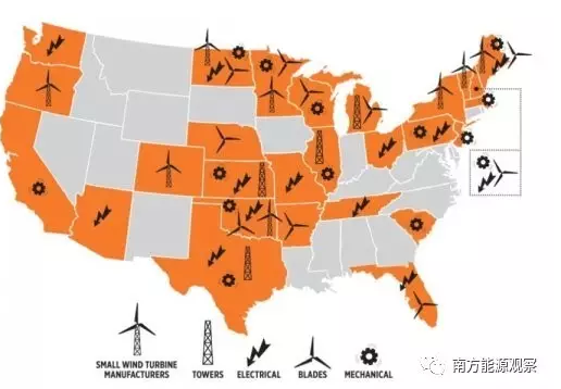 美國(guó)有27個(gè)州是生產(chǎn)各種小型風(fēng)力渦輪機(jī)組件的所在地