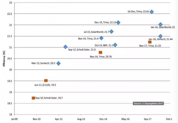 仔細(xì)觀察近幾年太陽(yáng)電池光電轉(zhuǎn)換效率的變化,會(huì)發(fā)現(xiàn)兩個(gè)特點(diǎn),其一,電池轉(zhuǎn)換效率平均約以0.3%/年的提升速度向前發(fā)展,此類情況主要集中于一線大廠之間,受制于技術(shù)瓶頸與研發(fā)投資,二三線電池生產(chǎn)商在高效電池開發(fā)方面難以獲得進(jìn)一步提升。