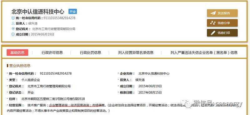 在“國家企業(yè)信用信息公示系統(tǒng)”的查詢結(jié)果中,北京中認(rèn)信通科技中心成立于2015年6月19日,并于今年8月15日剛剛通過了年度核準(zhǔn),注冊地址顯示為“北京市朝陽區(qū)五里橋二街1號(hào)院11號(hào)樓5層0518”,其經(jīng)營范圍包括技術(shù)推廣服務(wù)、企業(yè)管理咨詢、經(jīng)濟(jì)貿(mào)易咨詢和市場調(diào)查。
