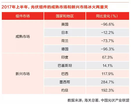 海外市場(chǎng):兩處明顯變化值得注意。一是從總體上來(lái)看,無(wú)論是硅片、電池片還是組件,中國(guó)企業(yè)的出口量都維持著高速增長(zhǎng),然而其出口額卻明顯同比下降,這說(shuō)明光伏組件的出口是在以量補(bǔ)價(jià),平均外銷價(jià)格要比去年低的多。二是從局部來(lái)看,國(guó)際市場(chǎng)結(jié)構(gòu)出現(xiàn)了明顯的變化,其中包括美國(guó)、德國(guó)、日本在內(nèi)的成熟市場(chǎng)出口額下滑明顯,而包括印度、巴西、墨西哥在內(nèi)的新興市場(chǎng)則出現(xiàn)了爆發(fā)式增長(zhǎng)。這主要是由于中國(guó)企業(yè)已經(jīng)有不少在成熟市場(chǎng)國(guó)家投資建廠,出貨量不再走海關(guān)統(tǒng)計(jì)口徑的原因。