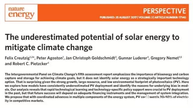 德國(guó)研究人員在最近一期《自然·能源》雜志上發(fā)表題為“The underestimated potential of solar energy to mitigate climate change”(太陽(yáng)能減緩氣候變化的潛力被低估)。在這篇文章中展示了下面的曲線圖: