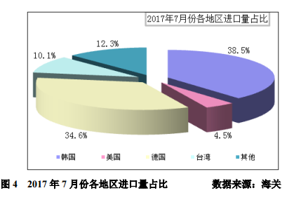 分國(guó)別來看:2017年7月份,自韓、德、美、中國(guó)臺(tái)灣這四個(gè)地區(qū)進(jìn)口量12025噸,占總進(jìn)口量的87.7%,進(jìn)口量占比分別為38.5%、34.6%、4.5%、10.1%,韓國(guó)進(jìn)口量仍居首位,德國(guó)進(jìn)口量占比大幅增加。分貿(mào)易方式來看:2017年7月份按加工貿(mào)易方式進(jìn)口多晶硅占比22.8%,其中自美國(guó)按加工貿(mào)易方式進(jìn)口占比為50.9%,100%通過保稅區(qū)倉(cāng)儲(chǔ)轉(zhuǎn)口方式進(jìn)入國(guó)內(nèi)。