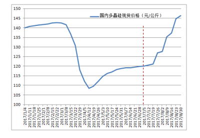圖1 2017年1月-2017年8月國(guó)內(nèi)多晶硅現(xiàn)貨價(jià)格 來源:硅業(yè)分會(huì)