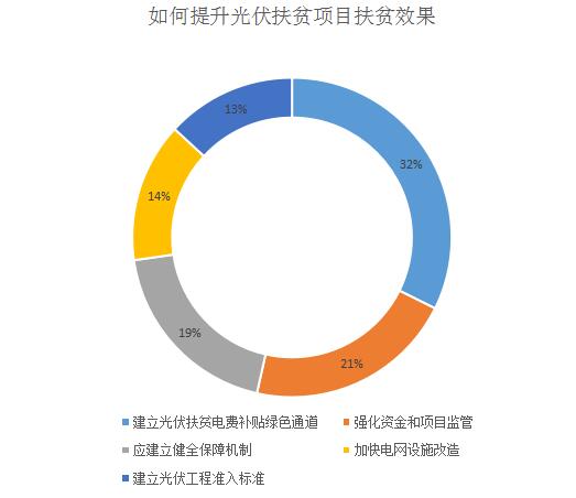 日前,中國電力新聞網(wǎng)以及中電傳媒微博、微信、論壇發(fā)起關(guān)于“如何提升光伏扶貧項目扶貧效果”的話題征集活動,調(diào)查結(jié)果顯示,有32%的受訪人群認為,應(yīng)建立光伏扶貧電費補貼綠色通道;21%的受訪人群認為,應(yīng)強化資金和項目監(jiān)管;19%受訪人群認為,應(yīng)建立健全保障機制;14%受訪人群認為,加快電網(wǎng)設(shè)施改造。13%受訪人群認為,應(yīng)建立光伏工程準入標準。