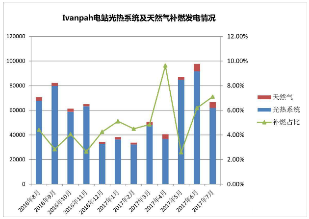 Ivanpah電站在2016年8月至2017年7月的天然氣補(bǔ)燃占比如圖所示: