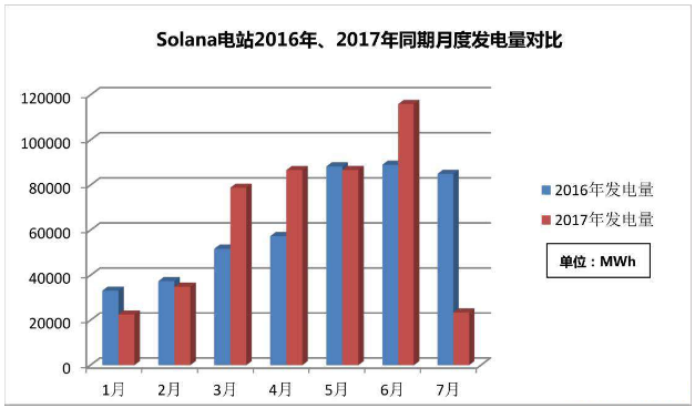 如圖所示,相較于2016年同期,Solana電站2017年3、4、6月的發(fā)電量顯著增長(zhǎng),而2、5月發(fā)電量與去年基本持平,1、7月則明顯低于7月。而2017年7月的發(fā)電量之所以銳減,應(yīng)與電站在當(dāng)月發(fā)生變壓器起火事故有關(guān),阻礙了該電站當(dāng)年再創(chuàng)新高的可能。