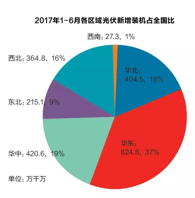 同時,光伏開發(fā)布局由西北地區(qū)向中東部地區(qū)轉(zhuǎn)移的趨勢更加明顯。1-6月,華東地區(qū)新增裝機(jī)為825萬千瓦,同比增加1.5倍,占全國的34%,其中浙江、江蘇和安徽三省新增裝機(jī)均超過200萬千瓦。華中地區(qū)新增裝機(jī)423萬千瓦,同比增加37%,占全國的17.3%。西北地區(qū)新增裝機(jī)為416萬千瓦,同比下降50%。