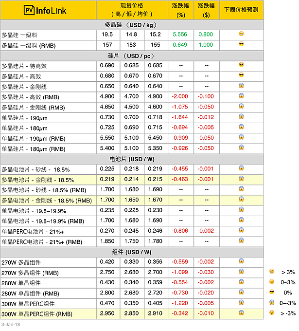 整體而言,需求從2017年上海光伏展開始一路暢旺至年底,然2018年度的淡季將至,市場對需求的看法已逐漸轉(zhuǎn)為保守看待,價格可能再從下游傳導回上游,再次出現(xiàn)再次出現(xiàn)整體供應鏈跌價的走勢。