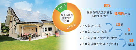 《太陽能發(fā)展“十三五”規(guī)劃》中明確指出,到2020年底,國內(nèi)太陽能發(fā)電裝機(jī)要達(dá)到1.1億千瓦以上,其中分布式光伏裝機(jī)要達(dá)6000萬千瓦以上,而2016年底分布式累計(jì)裝機(jī)僅為1032萬千瓦,剩余將近5000萬千瓦的巨大市場空間集中在分布式光伏。