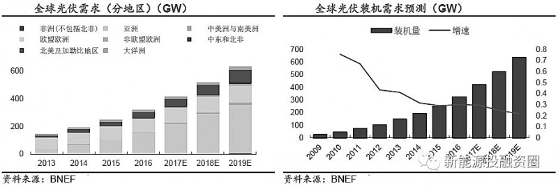 新興國家未來幾年光伏將迎來上升期,地理?xiàng)l件、政策支持將使裝機(jī)需求增幅較大。但總體量上對全球影響還是很小。2018 年全球裝機(jī)增加仍主要依靠中國、印度等光伏大國。