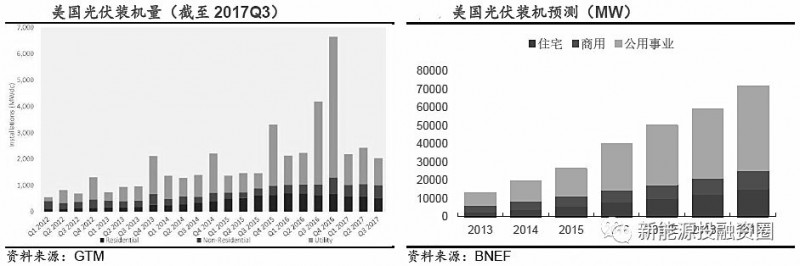 2017 年美國整體光伏裝機(jī)表現(xiàn)良好:17 年第一季度的安裝量為2044MWdc,比去年同期略有下滑,但考慮到16 年情況特殊,一季度整體可以。第二季度安裝量為2387MWdc,比去年同比增加8%,創(chuàng)史上二季度安裝量新高。三季度則為2031MWdc,低于去年,主要受政治不確定、設(shè)備價(jià)格上漲影響。總體來看,2017 美國光伏裝機(jī)量保持穩(wěn)定,預(yù)計(jì)2017 年全年安裝量會超過8GWdc。