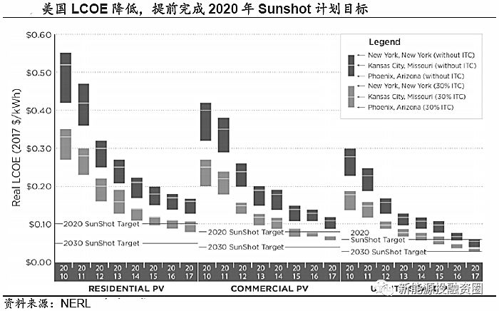 Sunshot 計(jì)劃降低太陽能發(fā)電成本,政策計(jì)劃推動光伏成本競爭優(yōu)勢:Sunshot 計(jì)劃于2011 年推出,旨在降低太陽能發(fā)電成本。住宅式和商用式光伏發(fā)電成本分別實(shí)現(xiàn)了2020年計(jì)劃的86%和89%,公用事業(yè)光伏發(fā)電已經(jīng)提前三年達(dá)到目標(biāo),成本已經(jīng)降到0.06美元/kWh。新Sunshot 計(jì)劃2030 年公用事業(yè)光伏發(fā)電成本0.3 美元/kWh,商用0.04美元/kWh,住宅0.05 美元/kWh,將消減太陽能發(fā)電成本50%。太陽能光伏發(fā)電成本優(yōu)勢突出。