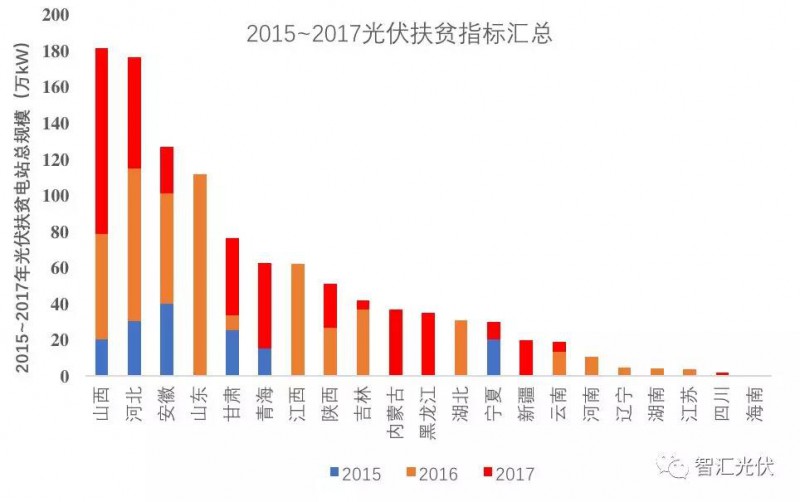 自2015年開始至今,國家共發(fā)布了3批光伏扶貧的指標(biāo),如下圖所示。 每年的光伏扶貧指標(biāo)具體情況如下。
