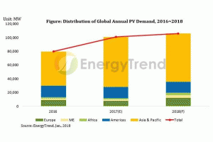 TrendForce的一個部門EnergyTrend估計,全球需求將在2018年進一步增加到106GW,但是地區(qū)需求的分布將會改變。