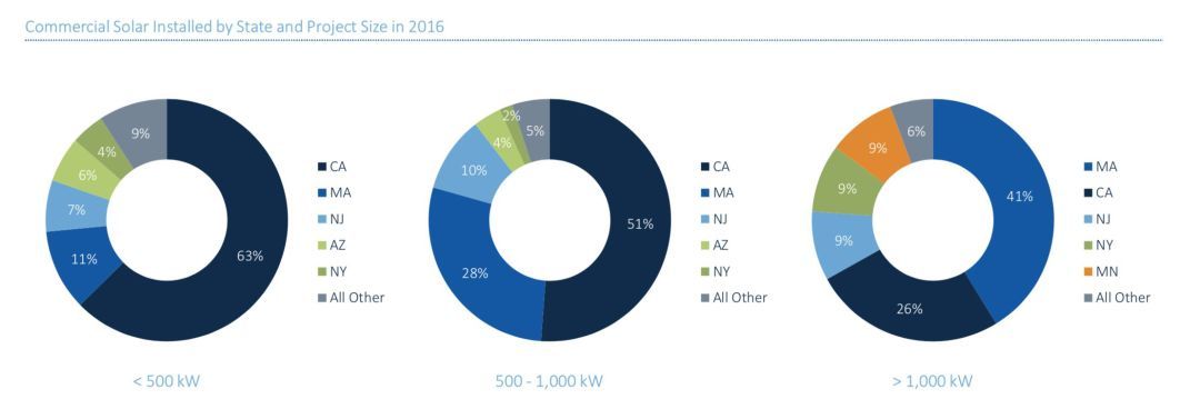 5、小型工商業(yè)光伏項(xiàng)目是市場(chǎng)的主流,在500KW以下的工商業(yè)分布式光伏市場(chǎng)以及500KW-1000MW的市場(chǎng)中,加州地區(qū)開發(fā)量最多,在1000KW以上的市場(chǎng)里,馬薩諸塞州表現(xiàn)最好。