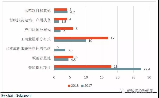 太陽能發(fā)電網(wǎng):展望2018年,由于指標(biāo)管理政策的嚴(yán)格,已建成但無法獲取指標(biāo)的項目可能不再出現(xiàn),因此我們認(rèn)為需求端普通指標(biāo)項目(普通集中式、集中式扶貧、地面分布式)會有所下降大約18GW;領(lǐng)跑者基地規(guī)模會進(jìn)一步擴大,預(yù)計在6-8GW左右;分布式電站會延續(xù)高增長,預(yù)計有23-25GW;光伏扶貧力度將進(jìn)一步增強,預(yù)計有4GW,示范電站和其他項目預(yù)計4-5GW,因此2018年國內(nèi)裝機規(guī)模約為55-60GW,需求依然強勢。2017和2018年中國光伏新增裝機結(jié)構(gòu)對比見下表(單位:GW)。