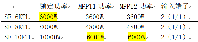 SE 6KTL、SE 8KTL、SE 10KTL輸入路數(shù)及MPPT數(shù)量一樣,但SE 10KTL單路MPPT(MPPT1或MPPT2)模塊最大輸入功率剛好6000W,等于SE 6KTL額定功率,故SE 10KTL可以通過只使用一路MPPT輸入降額成6kW使用;而SE 10KTL降額成8kW則必須通過縮短組串長度獲得,我們并不建議!