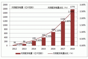 從2012-2018年,我國太陽能發(fā)電量從36億千瓦時增長至1775億千瓦時,平均每年增長高達8.3倍。太陽能發(fā)電量占比從0.1%到2.5%,占比逐漸加大。而發(fā)電量增幅(比上年增長)從414%降低到50%,總體呈現(xiàn)減弱態(tài)勢。2019年上半年,全口徑并網(wǎng)太陽能發(fā)電量為1063億千瓦時,同比增長29%,增幅減弱趨勢明顯。