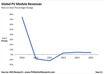 IMS Research最新季報顯示,快速下跌的光伏組件價格將導(dǎo)致2011-2012年全球光伏行業(yè)收益萎縮。光伏組件的過度供應(yīng)和激烈的市場競爭已致使2011年組件價格迅速下滑。盡管組件出貨量繼續(xù)增長,預(yù)計2011年收益仍將減少10%,2012年還會繼續(xù)下降。