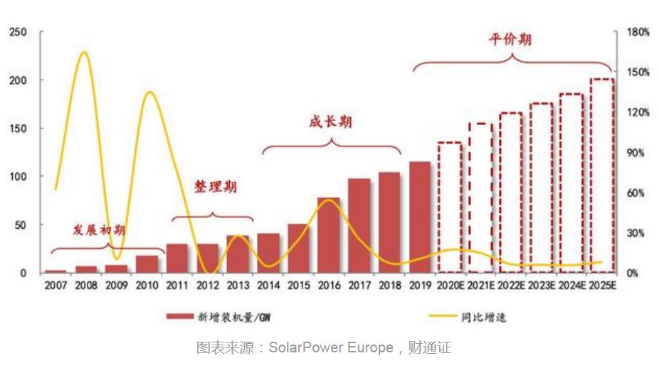 在太陽能發(fā)電平價(jià)上網(wǎng)前,光伏發(fā)電行業(yè)一直在各國政策補(bǔ)貼扶持下發(fā)展,政策周期導(dǎo)致光伏新增裝機(jī)也有較強(qiáng)的周期性。