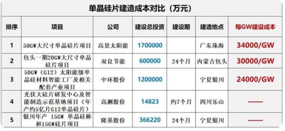 筆者統(tǒng)計(jì)數(shù)據(jù)發(fā)現(xiàn),目前單晶硅片領(lǐng)域兩個(gè)最大單體在建項(xiàng)目是高景太陽能、中環(huán)股份的 “50GW單晶硅片項(xiàng)目”,不過,建設(shè)成本卻有巨大差異。