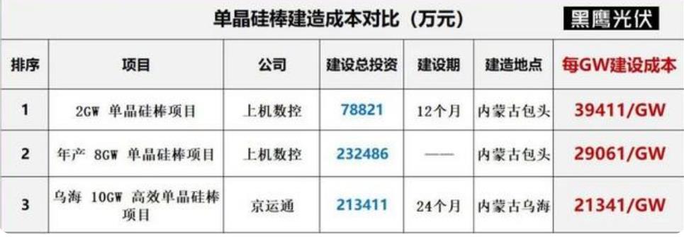 建設(shè)規(guī)模越大,投資成本越低。比如京運(yùn)通“烏海10GW高效單晶硅棒項(xiàng)目”每GW建設(shè)成本為21341萬元,這較上機(jī)數(shù)控“2GW單晶硅棒項(xiàng)目”建設(shè)成本低了45.85%。
