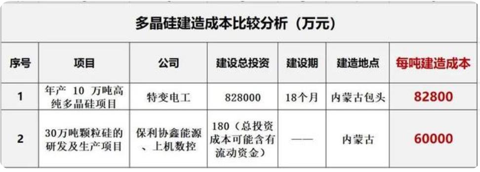 如下表所示,根據(jù)各自企業(yè)公開數(shù)據(jù),僅從建造成本角度來看,顆粒硅的建設(shè)成本確實(shí)要低于多晶硅。