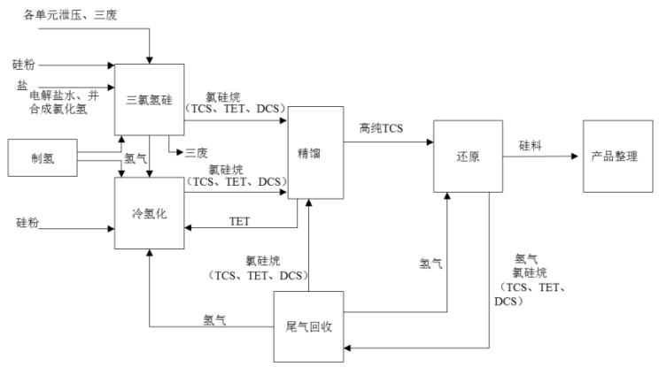 改良西門子法采用的中間體是三氯氫硅;同時,為了保證生產(chǎn)過程的高效和環(huán)保無污染,改良西門子法配備有一系列與三氯氫硅相關的原料和能量回收循環(huán)再利用系統(tǒng)。硅烷流化床法工藝采用的中間體是硅烷,與之配套的是制備硅烷的系統(tǒng)。理論上來講,過程中并不消耗氯和氫,這些元素僅在系統(tǒng)內(nèi)發(fā)揮中間轉化和傳遞的作用。