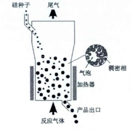 流化床法制備顆粒硅的研發(fā)歷史比較悠久,早在上世紀五十年代就有學者提出了通過化學氣相沉積的原理來制備多晶硅。隨后在此基礎上不斷改進,形成了目前的工藝。關鍵設備流化床反應器的關鍵工藝流程如下:作為晶種的高純度硅籽晶從流化床反應器上部加入后,堆積形成晶種顆粒床層,將床層加熱到反應要求的溫度后,從反應器底部通入硅烷、氫氣的混合氣使晶種床層達到流化狀態(tài),預熱的混合氣通過加熱床層時,硅烷分解形成單質硅沉積到硅籽晶表面(見圖3)。從反應溫度來講,硅烷在流化床內(nèi)熱解的溫度僅為500-800℃,遠低于改良西門子法1100℃左右的反應溫度。流化床工藝的特點給生產(chǎn)多晶硅帶來多重優(yōu)勢,硅烷流化床內(nèi)溫度分布比較均一,反應器內(nèi)硅沉積的表面積大,沉積速率快,可以實現(xiàn)連續(xù)進料、出料。