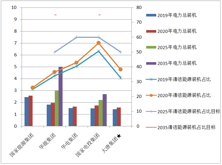 圖1 五大發(fā)電集團(tuán)2019、2020、2025、2035年電力總裝機(jī)及清潔能源裝機(jī)占比情況或目標(biāo)