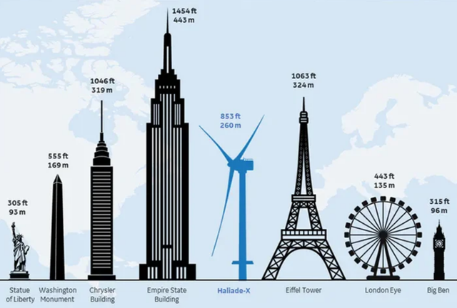 上圖:葡萄園風(fēng)電公司計劃使用世界上最大的渦輪機之一,通用電氣的Haliade-X,,以減少所需的渦輪機數(shù)量。每臺裝機容量為13兆瓦,葉片長度相當于一個足球場。