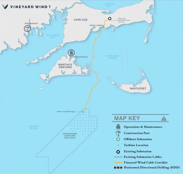 該風(fēng)電場的開發(fā)商計劃在距離馬薩諸塞州瑪莎葡萄園島約15英里(24公里)的大西洋洋面上安裝62臺巨型渦輪機,裝機容量足以為40萬戶家庭提供清潔能源。