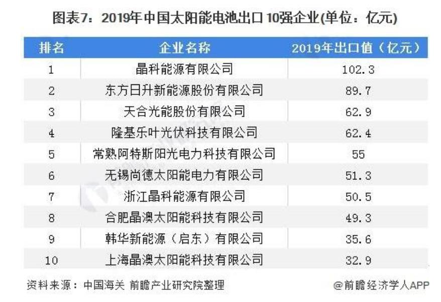 根據(jù)《中國海關》雜志2020年4月刊公布數(shù)據(jù)顯示,多家光伏企業(yè)躋身2019年出口前200強。其中晶科能源有限公司以102.3億元的出口值排名太陽能電池出口企業(yè)第一名;東方日升能源股份有限公司排名第二,出口值為89.7億元;天合光能股份有限公司排名第三,出口值為62.9億元。