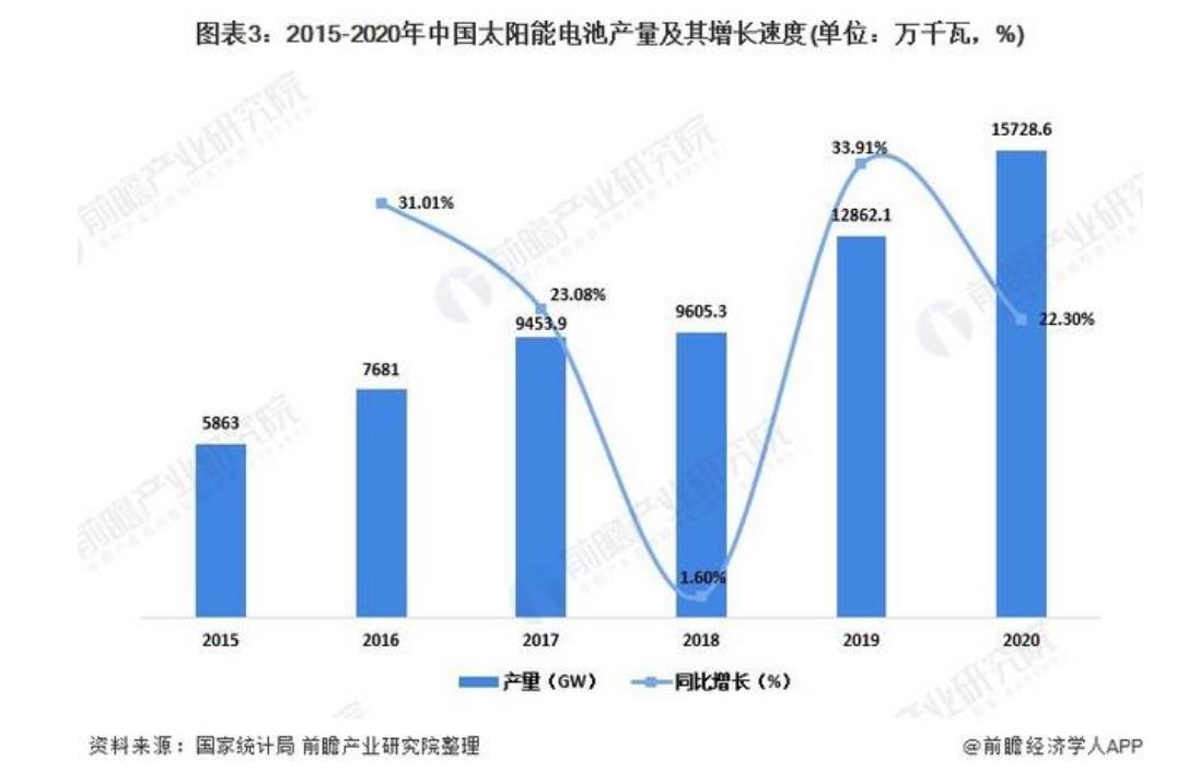 2015年以來,我國太陽能電池產(chǎn)量規(guī)模穩(wěn)步提升。據(jù)國家統(tǒng)計局統(tǒng)計數(shù)據(jù)顯示,2020年我國太陽能電池產(chǎn)量為15728.6萬千瓦,同比增長22.3%。