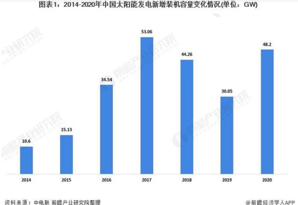 2018年和2019年,受光伏531新政影響,各地光伏發(fā)電新增項目有所下滑。2020年,太陽能發(fā)電新增裝機數(shù)據(jù)為48.2GW,繼續(xù)保持全球第一,創(chuàng)歷史第二新高,同比增長60%。