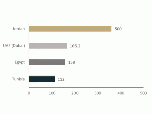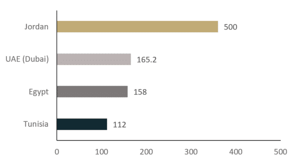 在中東和北非地區(qū),包括阿聯(lián)酋、阿曼、巴林、科威特、約旦、黎巴嫩、埃及、突尼斯、摩洛哥和阿爾及利亞,約旦、阿聯(lián)酋、埃及和突尼斯在裝機(jī)容量方面處于明顯領(lǐng)先地位。