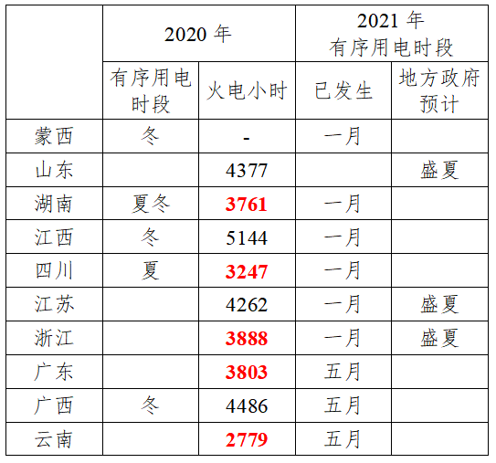 2020年迎峰度夏期間,湖南、四川等少數(shù)電網(wǎng)高峰時段有序用電;迎峰度冬期間,湖南、江西、廣西、蒙西高峰時段有序用電。2021年1月初寒潮,采暖負荷劇增,蒙西、江蘇、浙江、湖南、江西、四川有序用電或需求側(cè)響應(yīng)。2021年5月,云南、廣東、廣西相繼有序用電;江蘇、浙江、山東等多地預(yù)計,夏季可能面臨電力缺口。