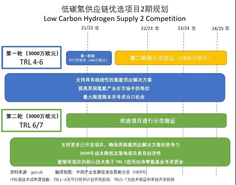 2020年4月,英國(guó)商業(yè)、能源和產(chǎn)業(yè)戰(zhàn)略部(BEIS)發(fā)布了低碳?xì)涔⿷?yīng)優(yōu)選項(xiàng)目(Hydrogen Supply Competition),資助3300萬英鎊,重點(diǎn)支持低碳?xì)涔⿷?yīng)解決方案的可行性研究以及典型示范項(xiàng)目的開發(fā)。