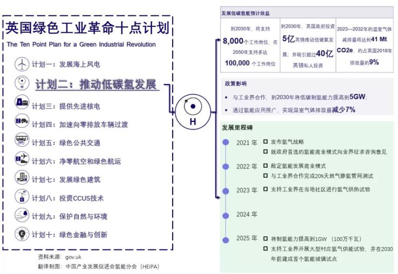 自2019年英國(guó)提出到2050年溫室氣體排放量至少減少100%的目標(biāo)(與1990年水平相比),即“凈零”(Net Zero)目標(biāo)后,氫能在推動(dòng)英國(guó)能源結(jié)構(gòu)轉(zhuǎn)型中的作用日益增加。2020年11月,英國(guó)政府正式公布綠色工業(yè)革命十點(diǎn)計(jì)劃,其中計(jì)劃二“推動(dòng)低碳?xì)浒l(fā)展”無論投資拉動(dòng)作用還是減排效應(yīng)都受到廣泛關(guān)注,進(jìn)而帶