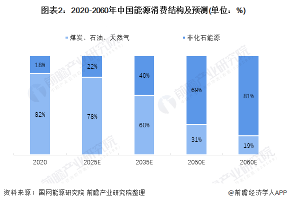 據(jù)國網(wǎng)能源研究院預測,至2035年,我國化石能源消費量占比將下降至60%;至2060年,化石能源消費量占比將下降至81%。而以新能源及可再生能源為主的非化石能源消耗比重將從2020年的18%提升至2060年的81.
