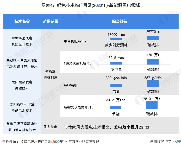 在發(fā)展重點方面,根據(jù)《綠色技術(shù)推廣目錄(2020年)》及相關(guān)規(guī)劃,風能、太陽能發(fā)電技術(shù)是新能源發(fā)電技術(shù)的發(fā)展重點,其中,有2項風電技術(shù)入選《目錄》,有3項太陽能發(fā)電技術(shù)入選《目錄》,每項技術(shù)的節(jié)能、碳減排效益如下: