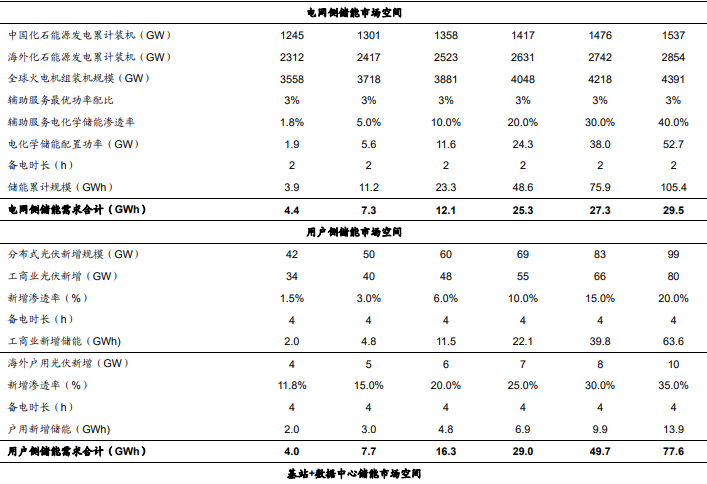 主要考慮工商業(yè)儲能、家庭儲能和5G基站及數(shù)據(jù)中心儲能。假設(shè)分布式光伏中,工商業(yè)光伏和戶用光伏配置比例為4:1,工商業(yè)配置儲能滲透率隨峰谷價差擴(kuò)大和儲能系統(tǒng)成本下降逐年升高,備電時長以4小時為主?紤]到中國居民電價偏低,民眾對儲能接受度較低,預(yù)計家庭儲能增量主要來自于歐美等發(fā)達(dá)國家市場,同樣以4小時備電時長為主。