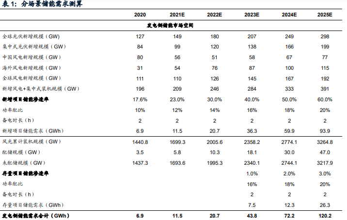 滲透率方面,2020年各省相繼出臺新能源場站配置10%-20%功率,2小時備電時長的儲能設(shè)施,據(jù)我們測算2020年全球新增項(xiàng)目配備儲能滲透率達(dá)17.6%,預(yù)計2021-2023年新增項(xiàng)目滲透率年提升7%,2023年儲能平價后存量項(xiàng)目配儲存在經(jīng)濟(jì)性,新增項(xiàng)目滲透率年提升10%,存量項(xiàng)目配儲需求年提升1%。