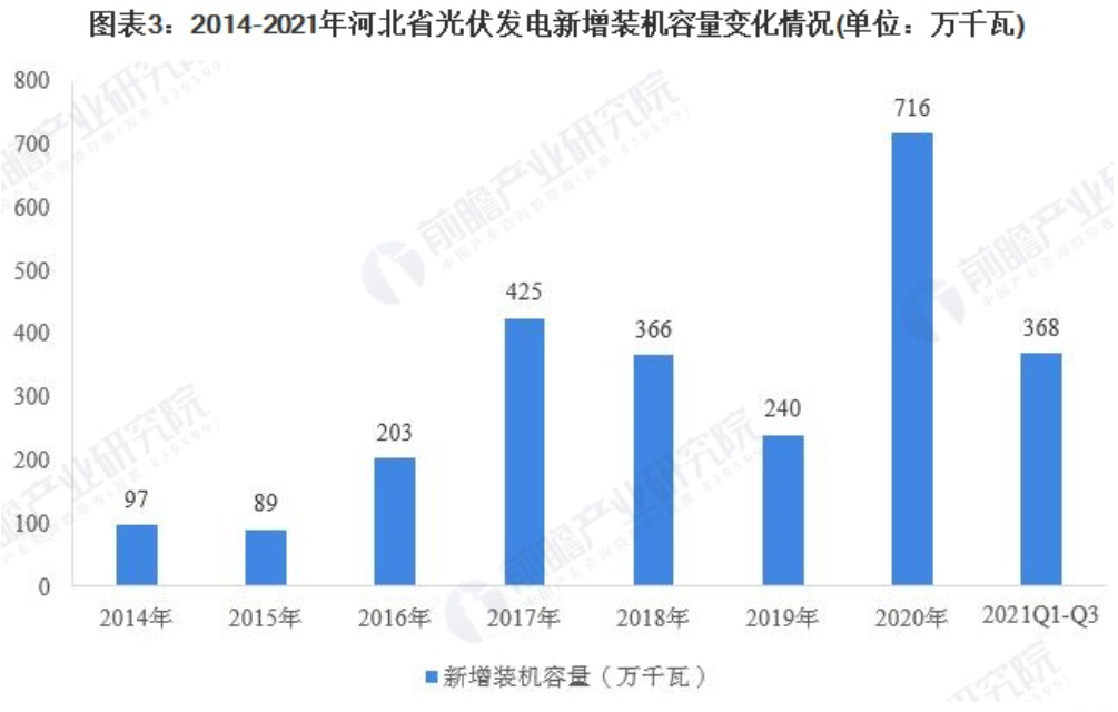 河北省光伏發(fā)電起步較早,自2014年以來河北省光伏新增裝機(jī)量全國占比一直保持在8%左右,擁有雄厚的發(fā)展基礎(chǔ),終于在2020年爆發(fā),全年新增裝機(jī)716萬千瓦,一舉躍升為新增裝機(jī)第一大省。截至2021年第三季度,河北省新增裝機(jī)容量為368萬千瓦。