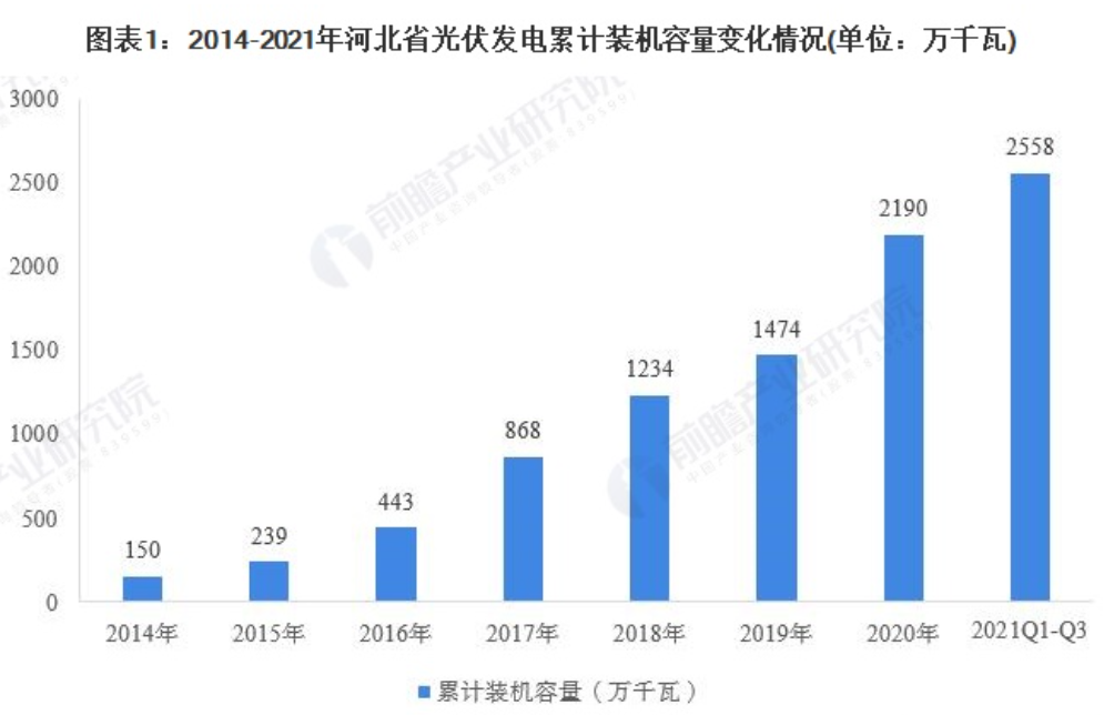 截至2021年第三季度,河北省光伏累計(jì)裝機(jī)容量為2558萬千瓦,目前,河北省光伏裝機(jī)總?cè)萘績H次于山東。
