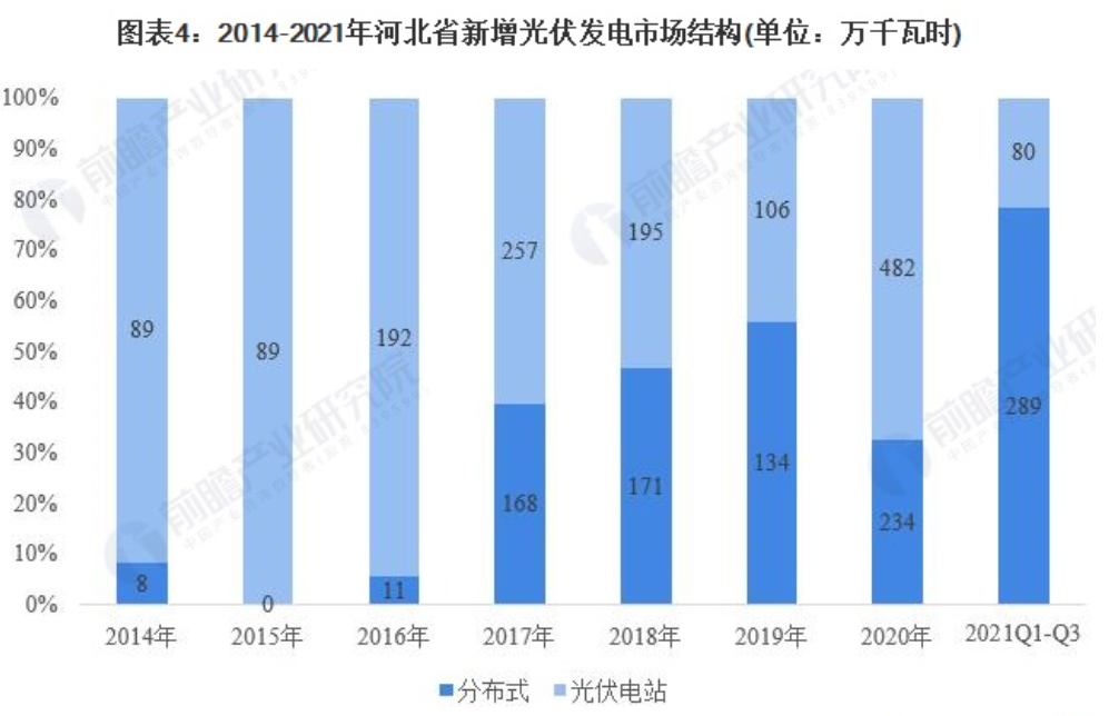 2021年以來,河北省新增光伏發(fā)電裝機(jī)結(jié)構(gòu)發(fā)生變化,分布式光伏裝機(jī)大幅領(lǐng)先于集中式光伏電站裝機(jī)量,2021年前三季度,河北新增分布式光伏裝機(jī)289萬千瓦時,占總新增量的78.4%。