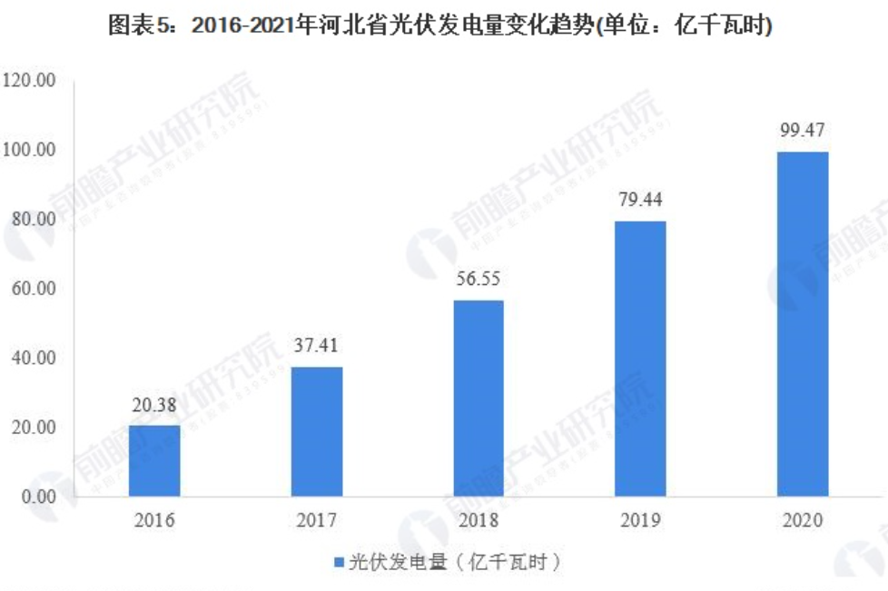 從電力生產(chǎn)來看,在光伏發(fā)電方面,2016-2020年,河北省光伏發(fā)電量保持平穩(wěn)增長,2016年全省光伏發(fā)電量僅20.38億千瓦時,到2020年增長至99.47億千瓦時。